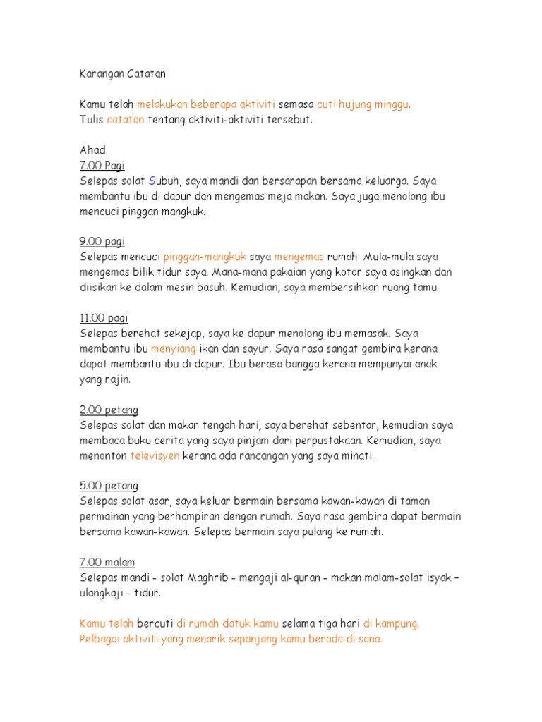 Contoh Karangan Catatan Minggu Pe_JaggerWillis955 June 11 2022 Nilai MurniNilai Kemanusiaan Semua perkara atau perbuatan baik yang boleh dijadikan contoh oleh pembaca yang terdapat dalam novelantara nilai murni yang biasanya dipaparkan oleh pengarang ialah nilai kasih sayang berdikari amanah bekerjasama hormat-menghormati keadilan. Karangan catatan diari. Nota Tatabahasa UPSR 9 Latihan Tatabahasa.